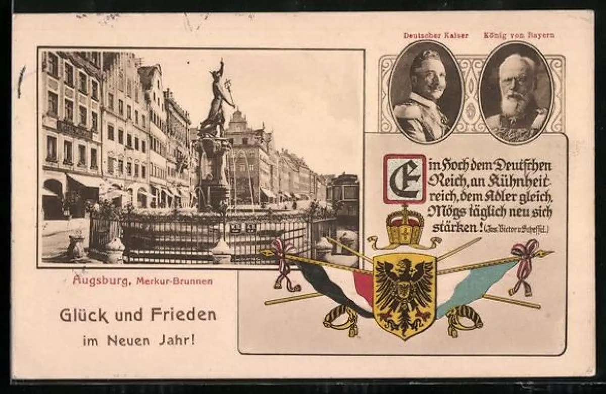AK Augsburg, Merkur-Brunnen, Deutscher Kaiser, König von Bayern, Neujahrsgruss