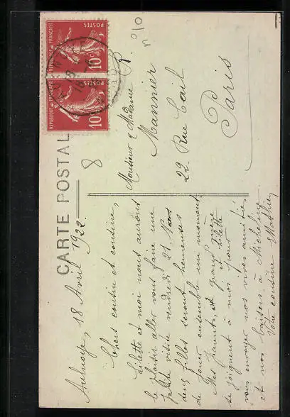 Personenbezogene Daten auf der Rückseite der Karte wurden durch blauen Textmarker unkenntlich gemacht. Die blauen Stellen sind auf die Vorderseite durchgeweicht und wirken sich negativ auf das Postkartenfoto aus