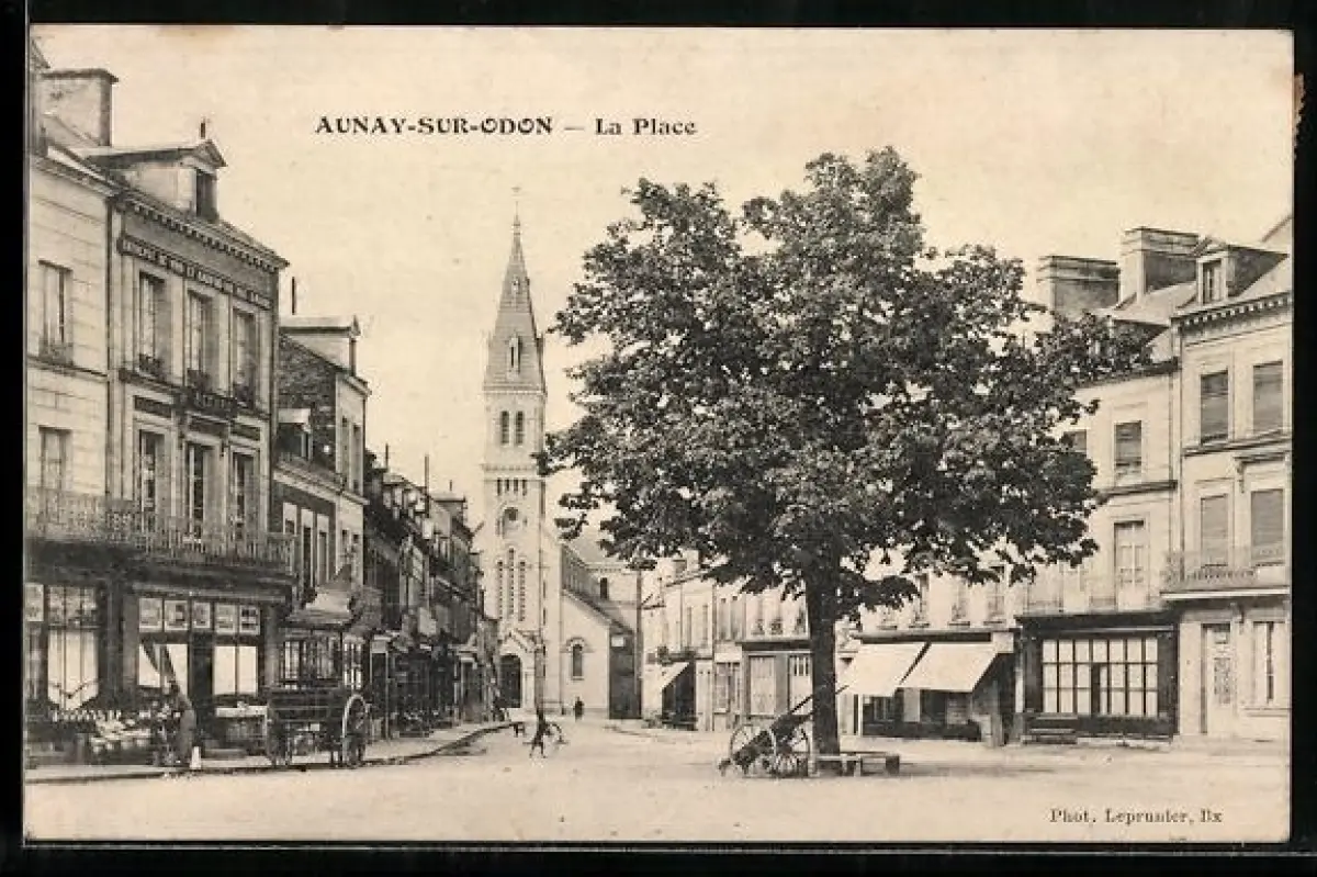 AK Aunay-sur-Odon, La Place avec l`église et les bâtiments environnants