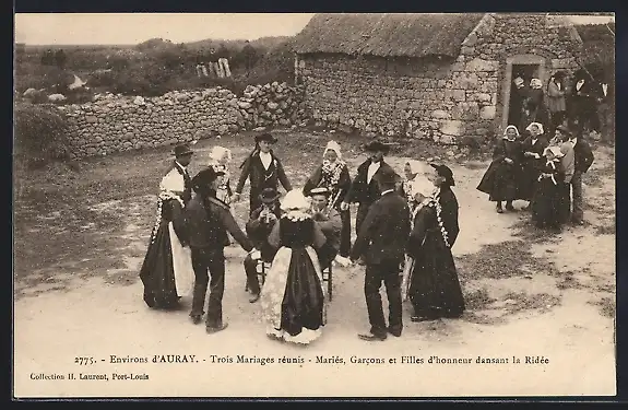 AK Auray, Trois Mariages réunis, Mariés, Garcons et Filles d`honneur dansant la Ridée, Volkstanz