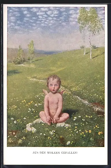 AK Aus den Wolken gefallen, Engel sitzt verdutzt auf einer Wiese