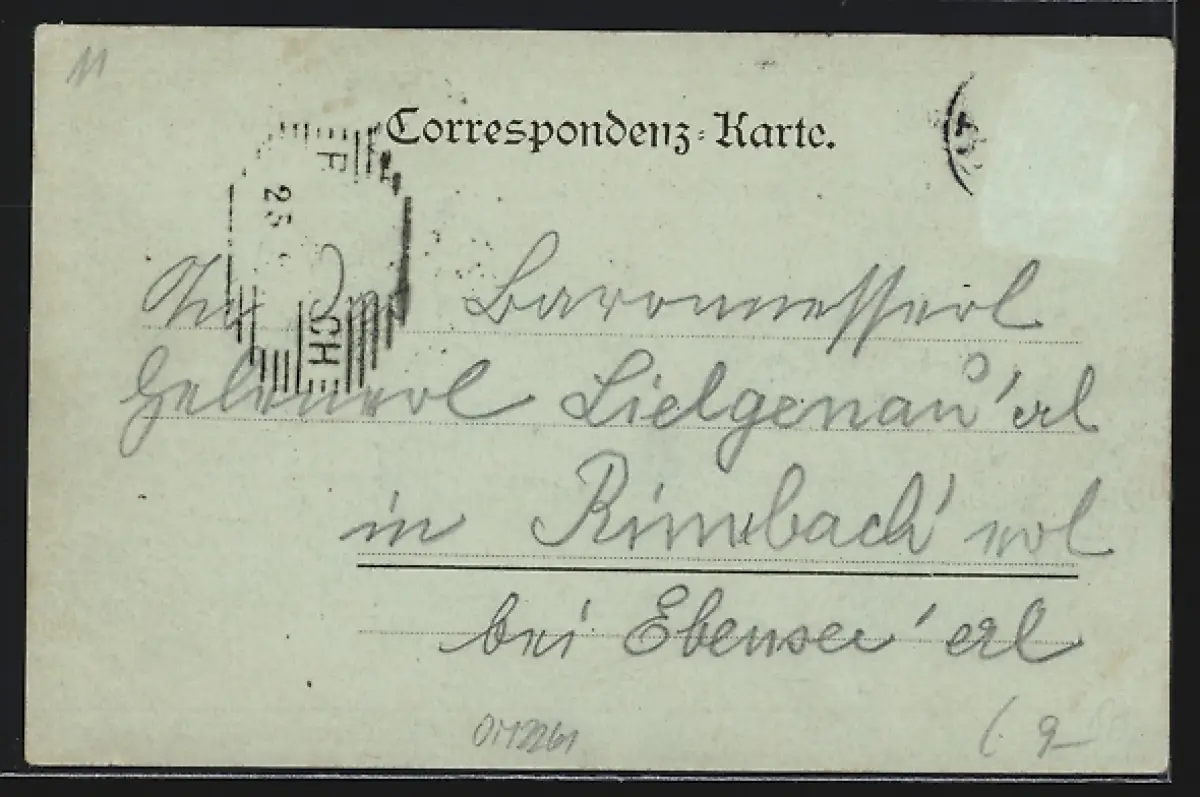 Personenbezogene Daten auf der Rückseite der Karte wurden durch blauen Textmarker unkenntlich gemacht. Die blauen Stellen sind auf die Vorderseite durchgeweicht und wirken sich negativ auf das Postkartenfoto aus