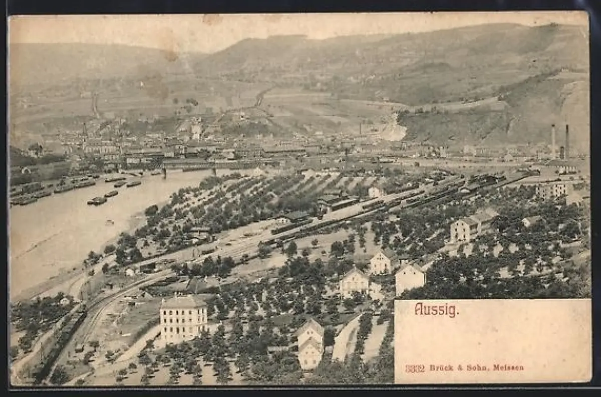 AK Aussig, Ortsansicht mit Fluss und Brücke