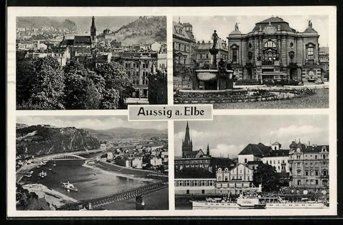 AK Aussig-Usti, Ortspartie mit Elbdampfer Bastei, Brunnen vor dem Theater und Strassenbahn, Blick zur Kirche