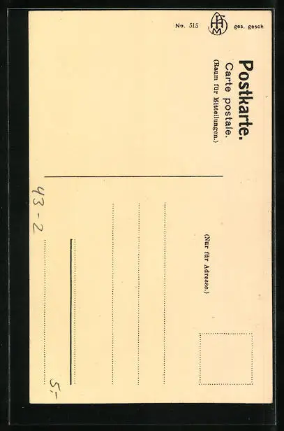 Personenbezogene Daten auf der Rückseite der Karte wurden durch blauen Textmarker unkenntlich gemacht. Die blauen Stellen sind auf die Vorderseite durchgeweicht und wirken sich negativ auf das Postkartenfoto aus