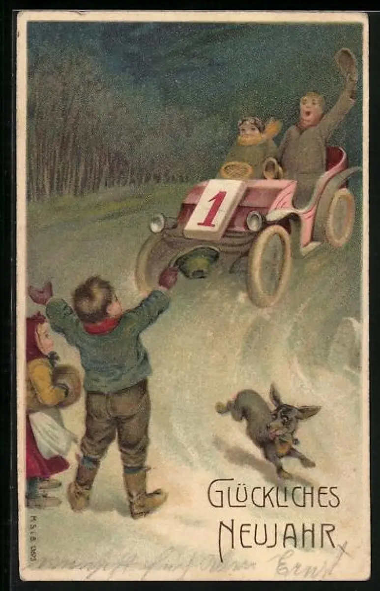 AK Auto fährt durch den Schnee, Neujahrsgruss