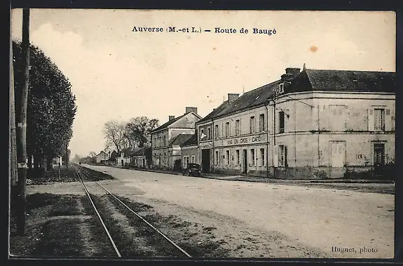 AK Auverse, Route de Baugé avec voie ferrée et bâtiments adjacents