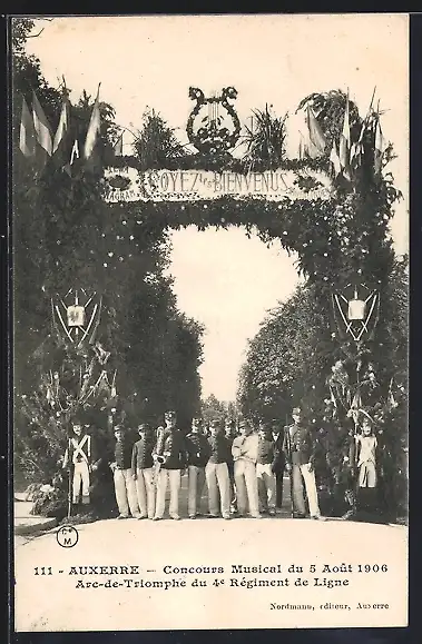 AK Auxerre, Concours Musical du 5 Aout 1906 - Arc-de-Triomphe du 4. Règiment de Ligne