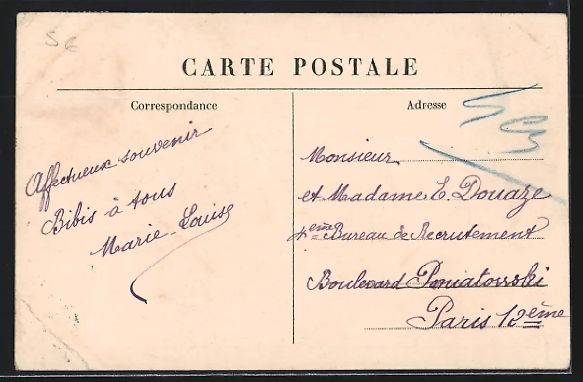 Personenbezogene Daten auf der Rückseite der Karte wurden durch blauen Textmarker unkenntlich gemacht. Die blauen Stellen sind auf die Vorderseite durchgeweicht und wirken sich negativ auf das Postkartenfoto aus