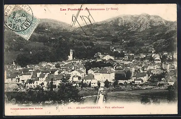 AK Ax-les-Thermes, Vue générale avec montagnes en arrière-plan