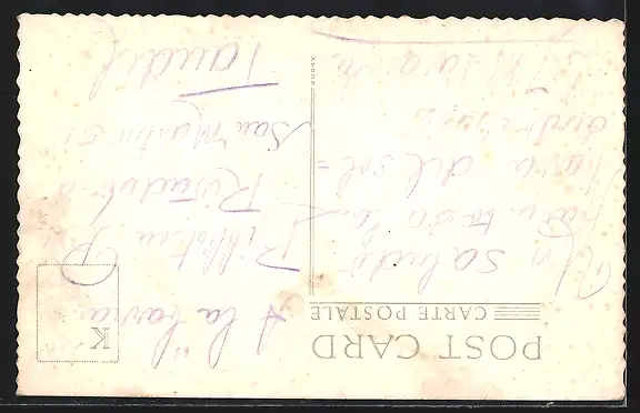 Personenbezogene Daten auf der Rückseite der Karte wurden durch blauen Textmarker unkenntlich gemacht. Die blauen Stellen sind auf die Vorderseite durchgeweicht und wirken sich negativ auf das Postkartenfoto aus