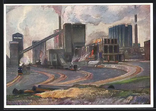 AK B.V.-Benzol, B.V. Aral, Industrie-Erdöl-Gelände, Dampfer, Eisenbahn