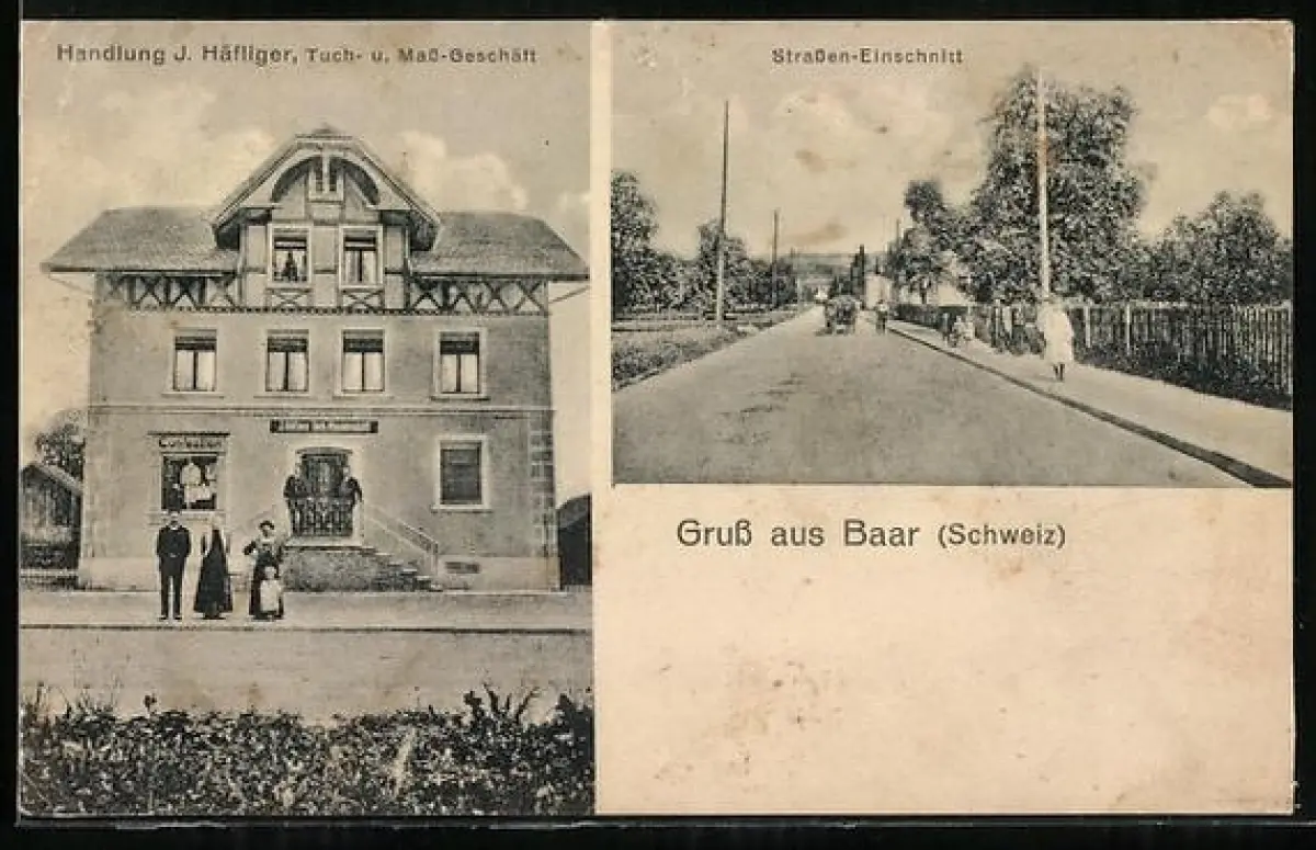 AK Baar /ZG, Tuch- und Mass-Geschäft J. Häfliger, Ortspartie