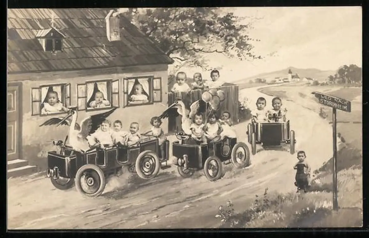 AK Babys mit Klapperstörchen in Autos vor einem Haus, Babys in Fenstern
