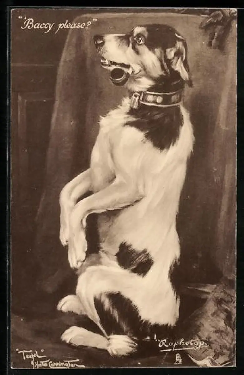 AK Baccy please, Männchen machender Hund mit Pfeife in der Schnauze