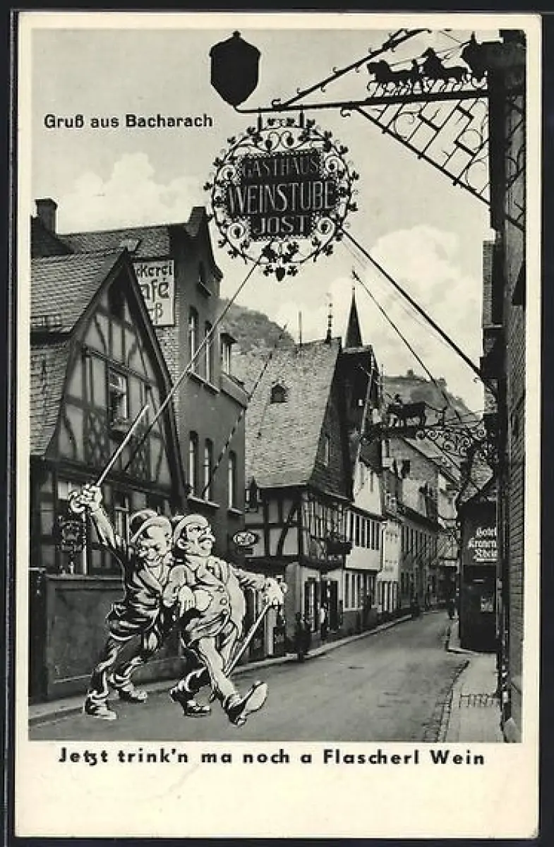 AK Bacharach /Rh., Gasthaus Weinstube Jost mit Strasse, Angetrunkene Gäste