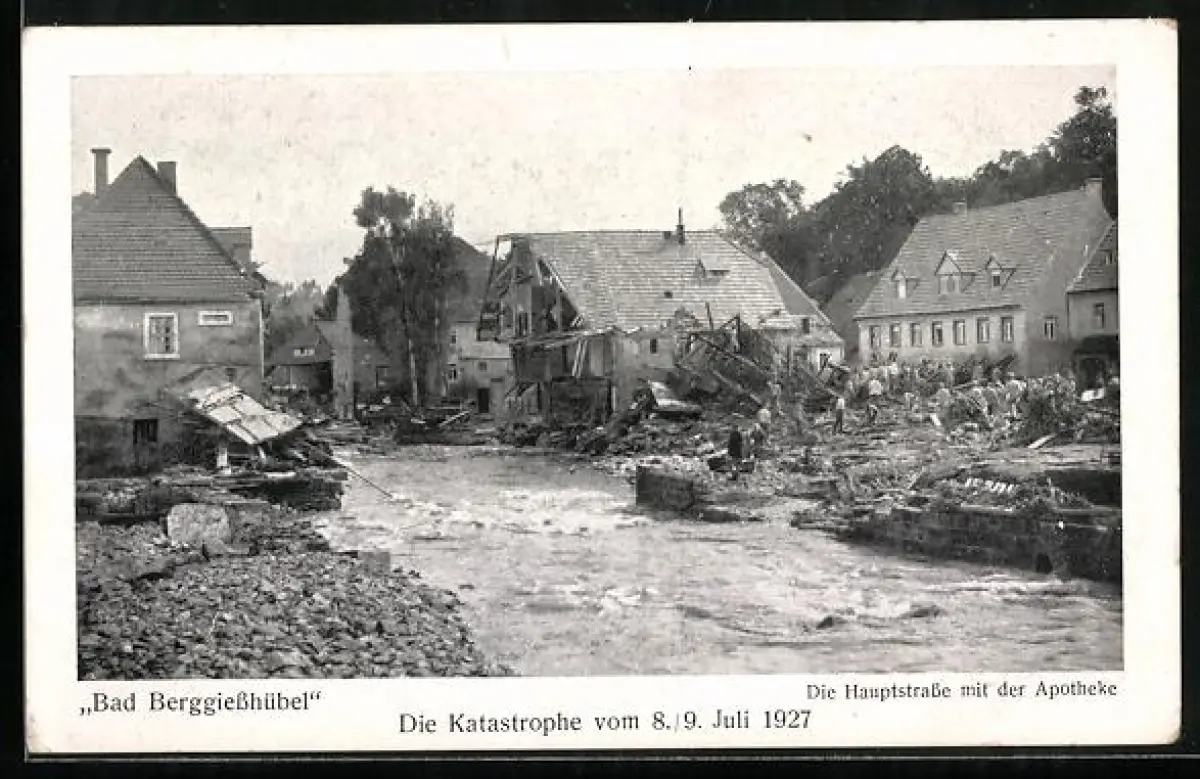 AK Bad Berggiesshübel, Hochwasser 8. /9. Juli 1927, Hauptstrasse mit der Apotheke