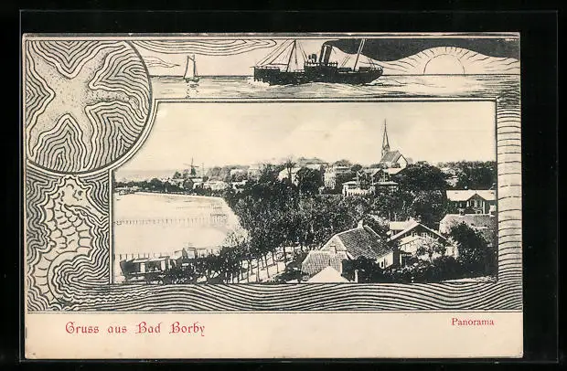 AK Bad Borby bei Eckernförde, Panorama, Segelschiffe, Seepferdchen und -stern