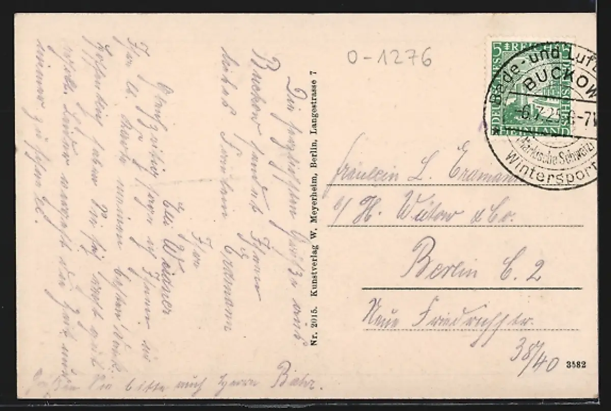 Personenbezogene Daten auf der Rückseite der Karte wurden durch blauen Textmarker unkenntlich gemacht. Die blauen Stellen sind auf die Vorderseite durchgeweicht und wirken sich negativ auf das Postkartenfoto aus