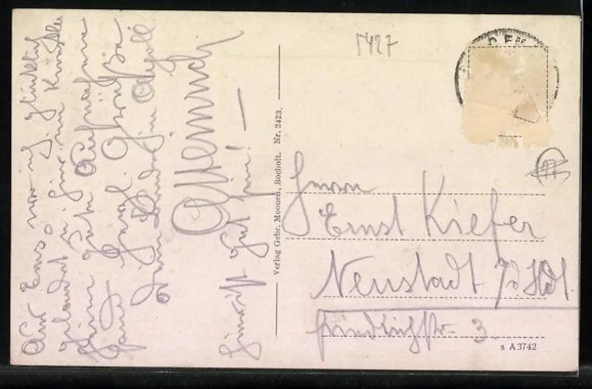 alte Ansichtskarte, gelaufen, Briefmarke entfernt, rückseitig Oberflächenschaden, guter Zustand