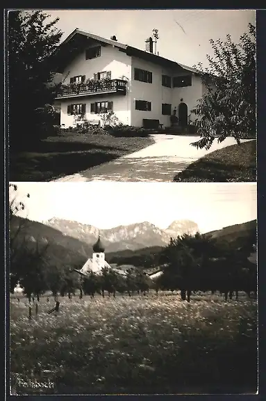 AK Bad Feilenbach, Haus mit Einfahrt, Kirche mit Bergpanorama