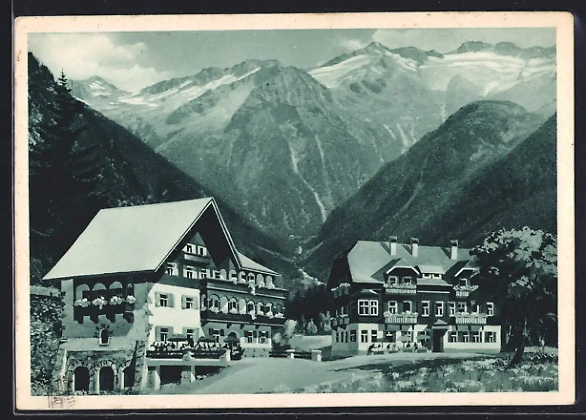 AK Bad Gastein, Hotel Grüner Baum, Ortsansicht mit Berge