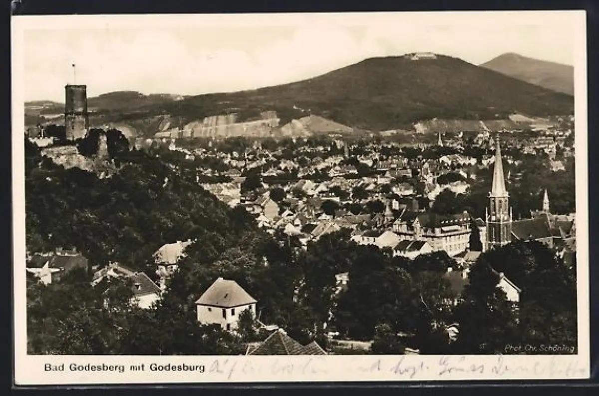AK Bad Godesberg, Blick auf die Stadt mit Godesburg und Gebirge