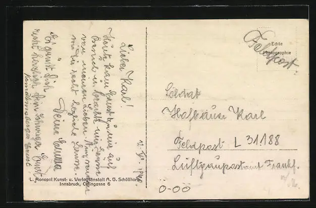 Personenbezogene Daten auf der Rückseite der Karte wurden durch blauen Textmarker unkenntlich gemacht. Die blauen Stellen sind auf die Vorderseite durchgeweicht und wirken sich negativ auf das Postkartenfoto aus