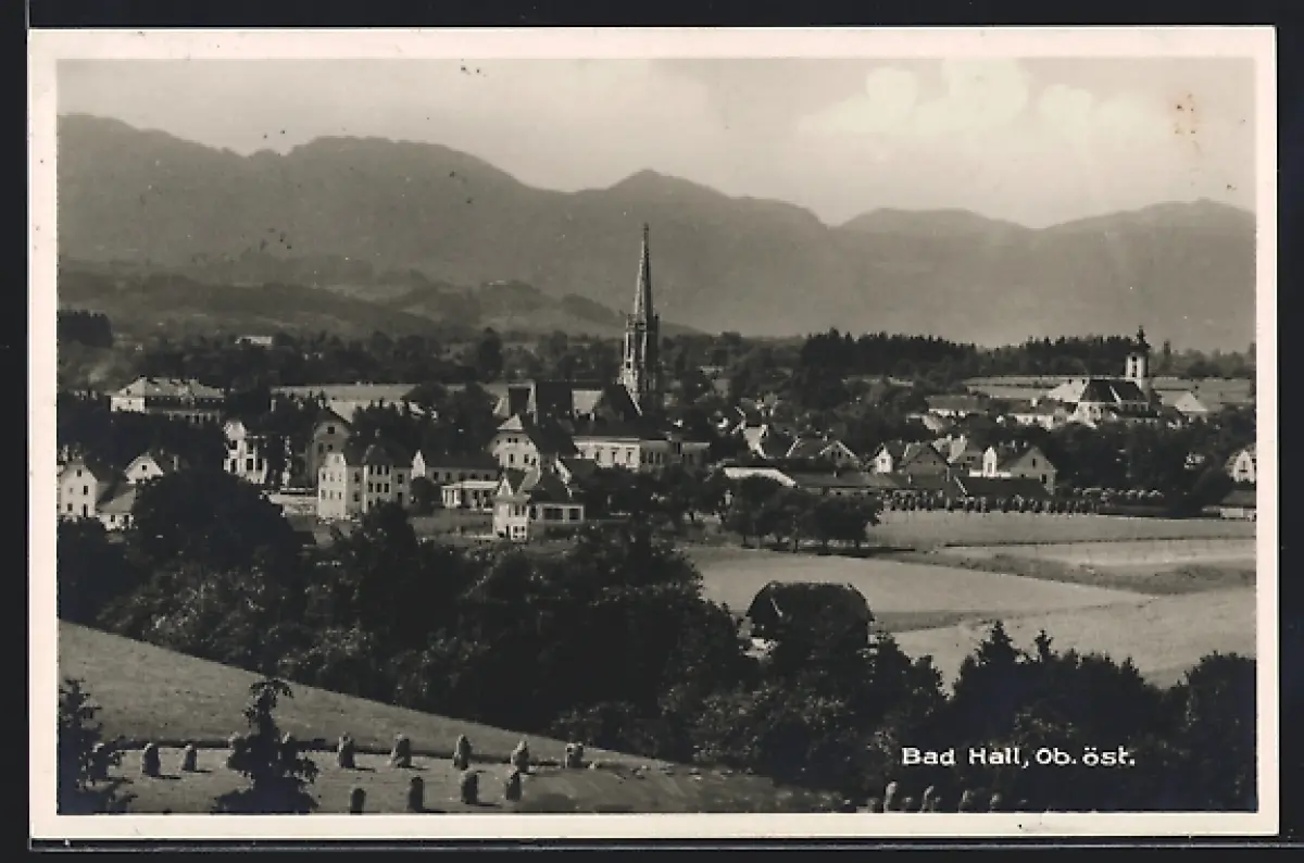 AK Bad Hall /Ob.Öst., Ortsansicht mit Kirche, im Vordergrund Heugarben