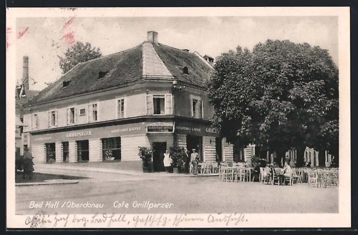 AK Bad Hall /Oberdonau, Café Grillparzer mit Vorplatz