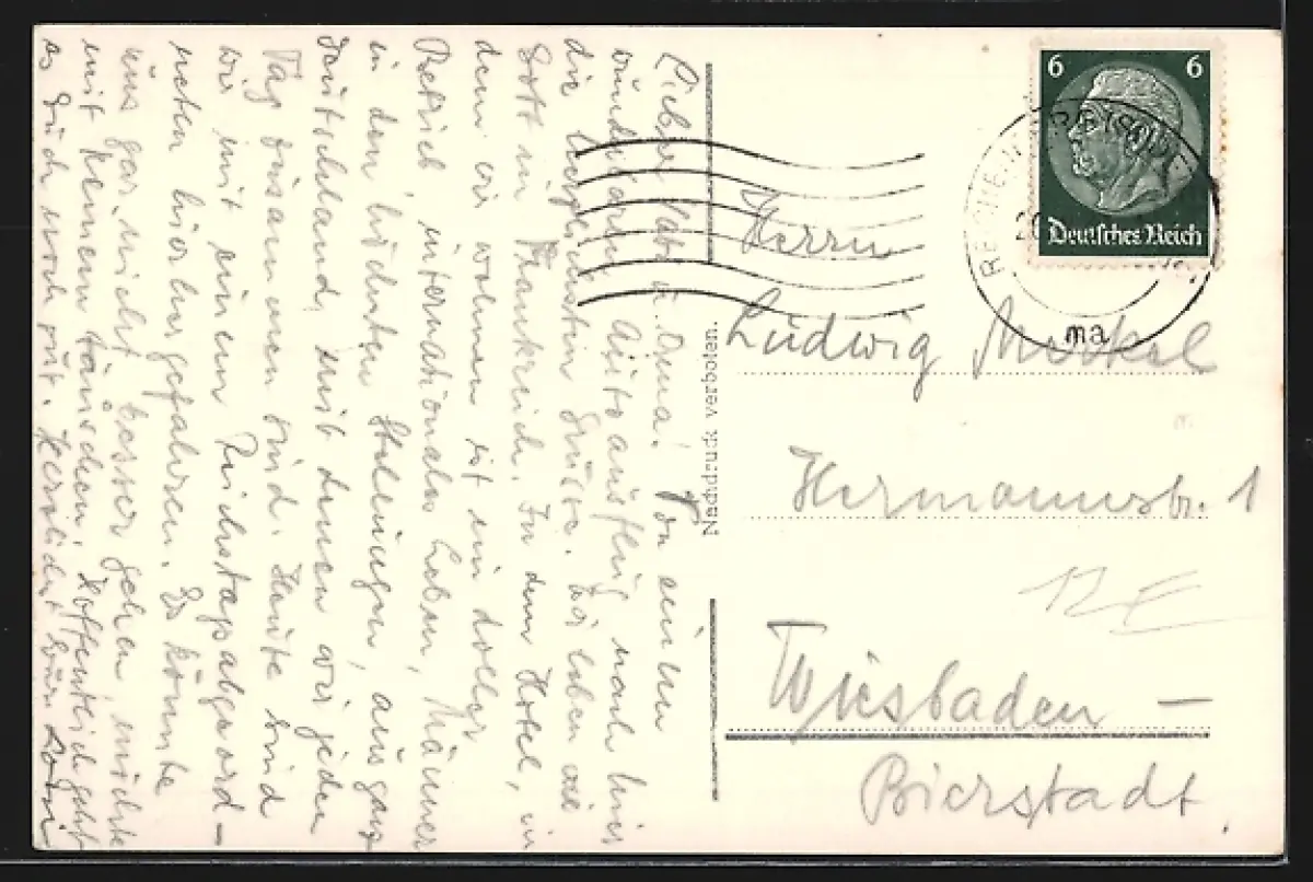 Personenbezogene Daten auf der Rückseite der Karte wurden durch blauen Textmarker unkenntlich gemacht. Die blauen Stellen sind auf die Vorderseite durchgeweicht und wirken sich negativ auf das Postkartenfoto aus