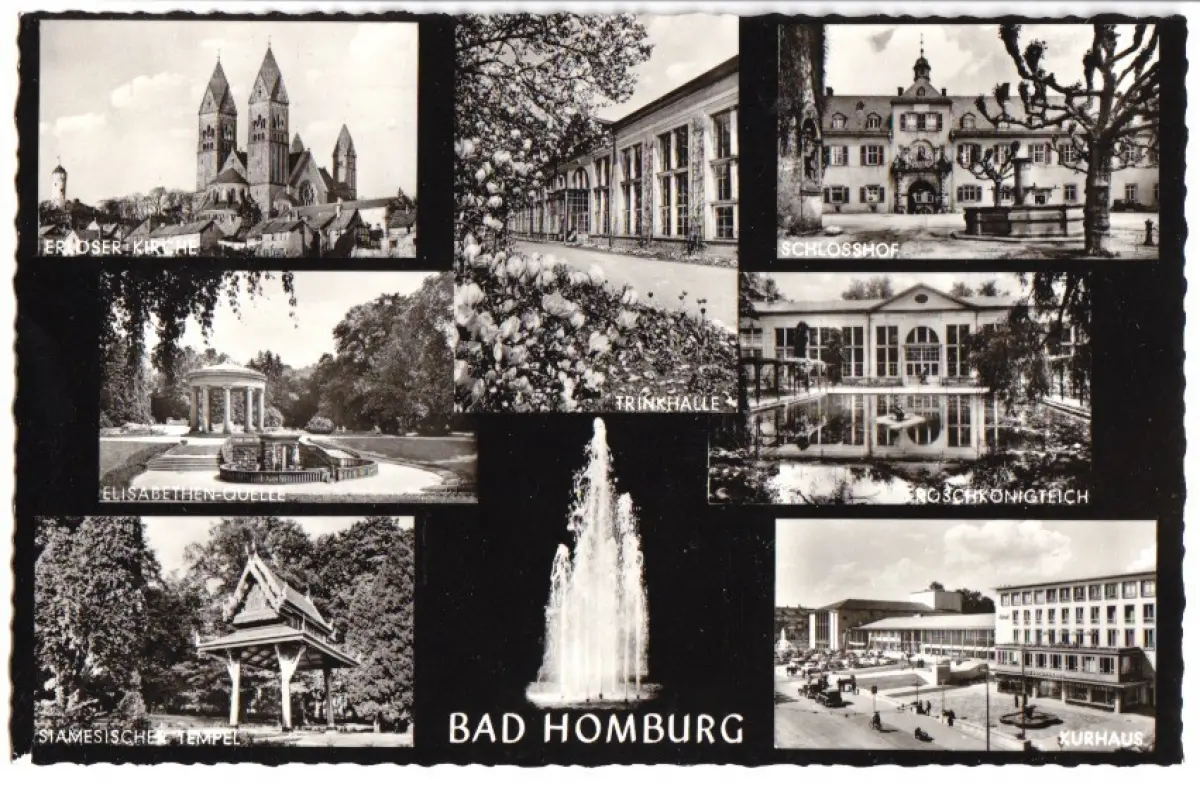 Ansichtskarte Bad Homburg sieben Abb., gestaltet Erlöser-Kirche, Schlosshof, Elisabethen-Quelle, Trinkhalle, Froschkönigteich, Siamesischer Tempel, Kurhaus Erhaltung I-II postalisch gelaufen, gestempelt: Bad Homburg v.d. Höhe, 10.9.65 Verlag: fifo, Bad Homburg