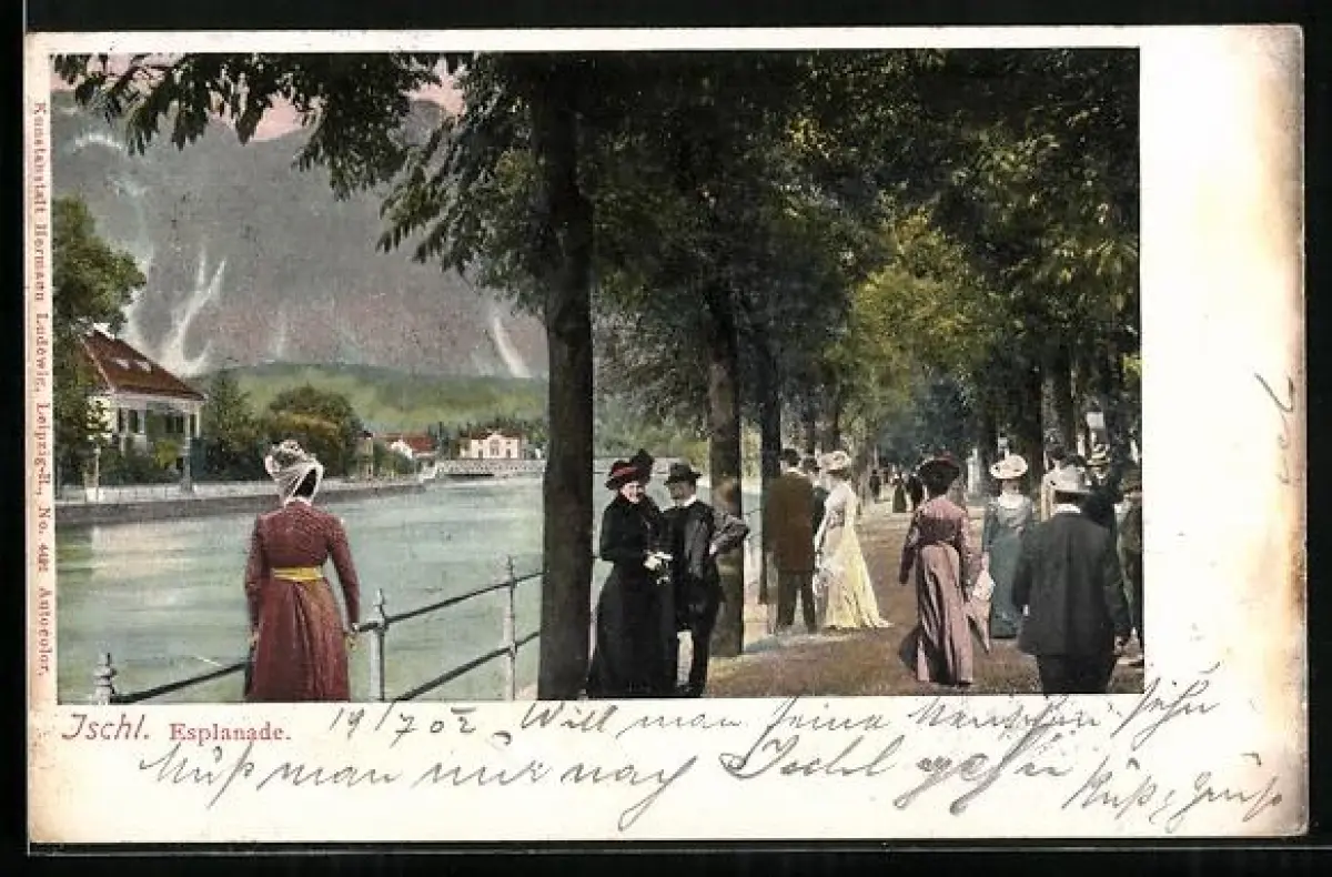 AK Bad Ischl, Esplanade mit Wasserfall im Hintergrund