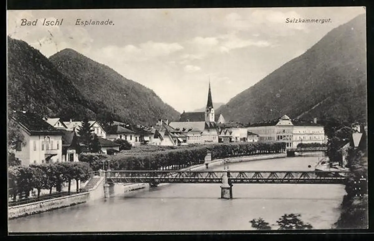 AK Bad Ischl /Salzkammergut, Esplanade mit Brücke und Kirche