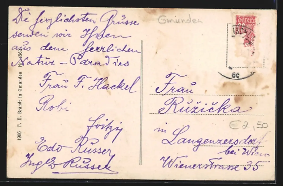 Personenbezogene Daten auf der Rückseite der Karte wurden durch blauen Textmarker unkenntlich gemacht. Die blauen Stellen sind auf die Vorderseite durchgeweicht und wirken sich negativ auf das Postkartenfoto aus