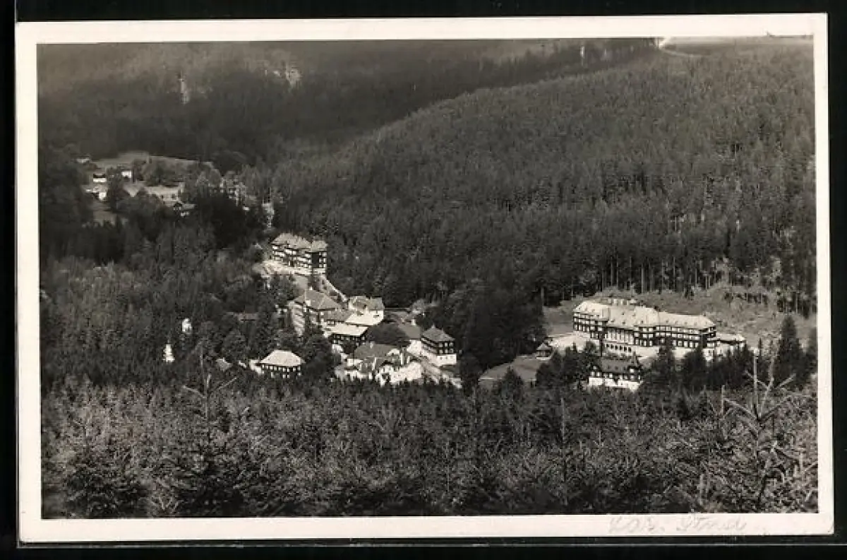 AK Bad Karlsbrunn, Ortsansicht vom Berghang aus mit umliegenden Wäldern