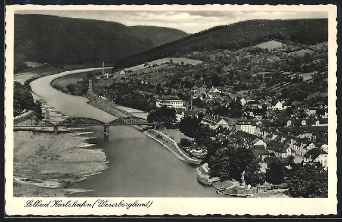 AK Bad Karlshafen /Weserbergland, Stadtansicht mit Weser und Brücke