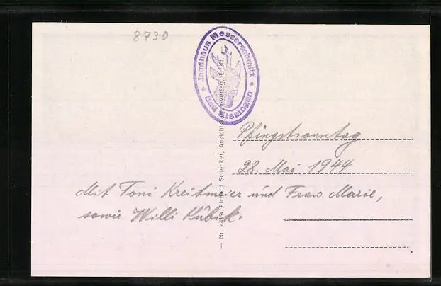 Personenbezogene Daten auf der Rückseite der Karte wurden durch blauen Textmarker unkenntlich gemacht. Die blauen Stellen sind auf die Vorderseite durchgeweicht und wirken sich negativ auf das Postkartenfoto aus