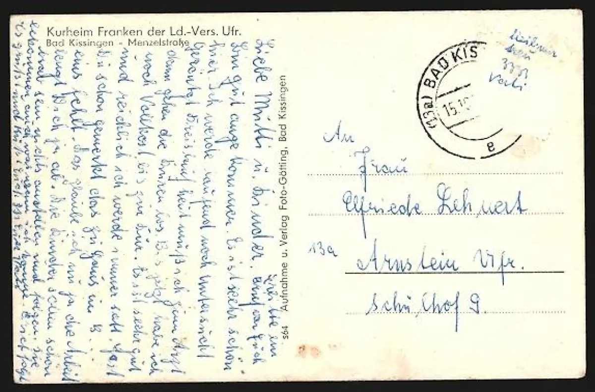 Personenbezogene Daten auf der Rückseite der Karte wurden durch blauen Textmarker unkenntlich gemacht. Die blauen Stellen sind auf die Vorderseite durchgeweicht und wirken sich negativ auf das Postkartenfoto aus