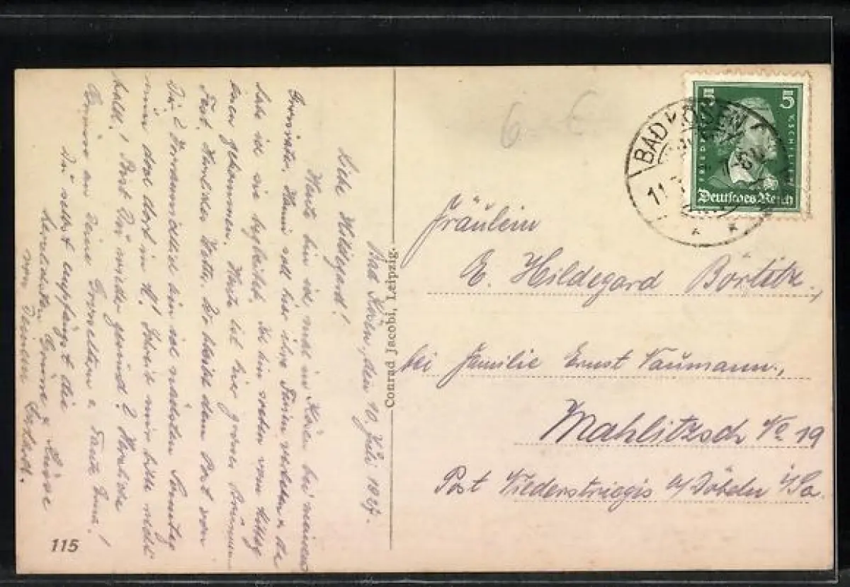 Personenbezogene Daten auf der Rückseite der Karte wurden durch blauen Textmarker unkenntlich gemacht. Die blauen Stellen sind auf die Vorderseite durchgeweicht und wirken sich negativ auf das Postkartenfoto aus