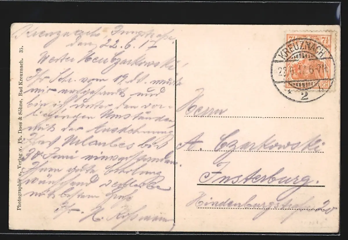 Personenbezogene Daten auf der Rückseite der Karte wurden durch blauen Textmarker unkenntlich gemacht. Die blauen Stellen sind auf die Vorderseite durchgeweicht und wirken sich negativ auf das Postkartenfoto aus