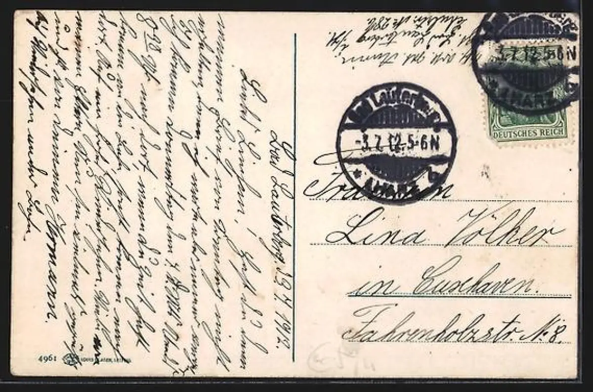alte Ansichtskarte, gelaufen 1912, Stempelspur, Eckknicke li. unten und re. oben, guter Zustand