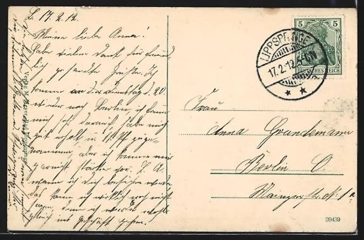 gelaufen 1912, Eckknick unten li., guter Zustand