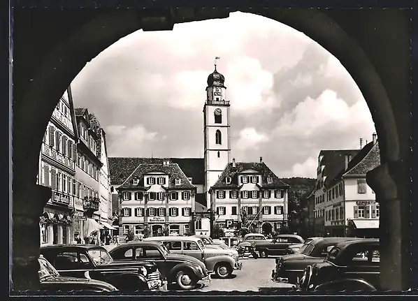 AK Bad Mergentheim, Marktplatz und Stadtkirche, VW-Käfer