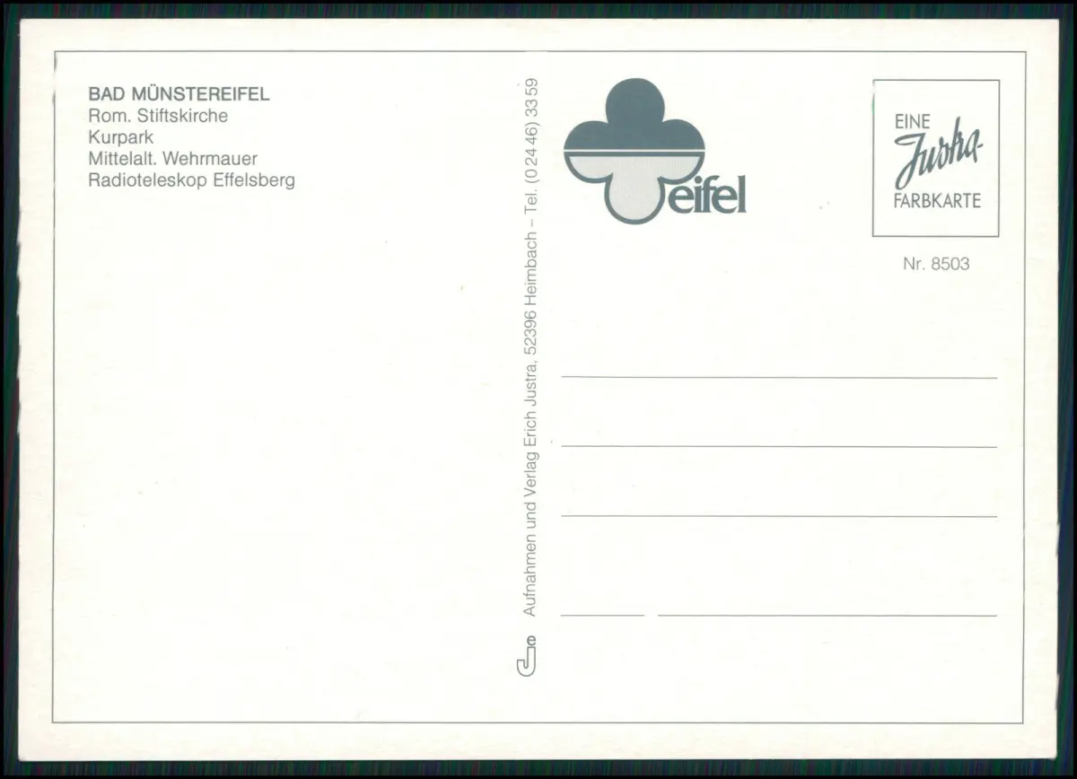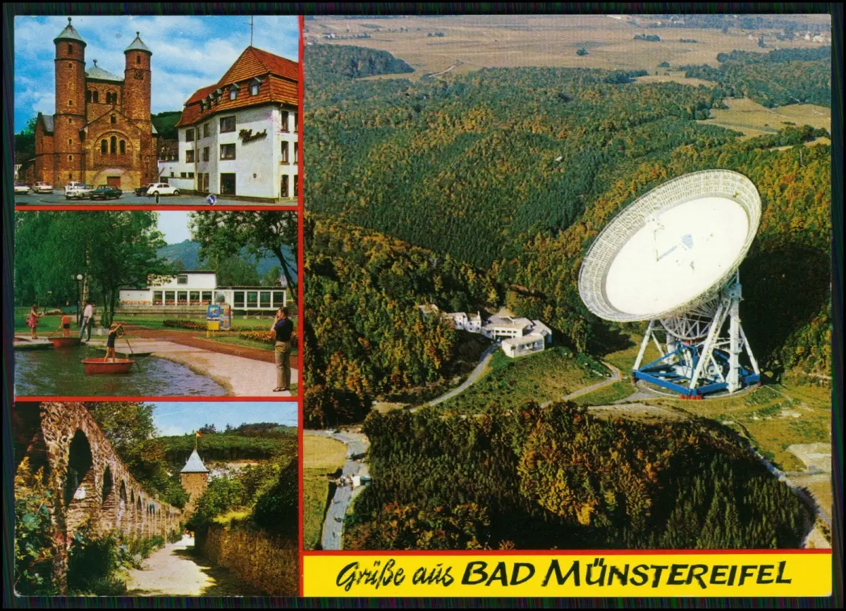 Mehrbildige Karte mit Stiftskirche, Kurpark, Wehranlage, großem Radioteleskop Effelsberg und Umgebung.