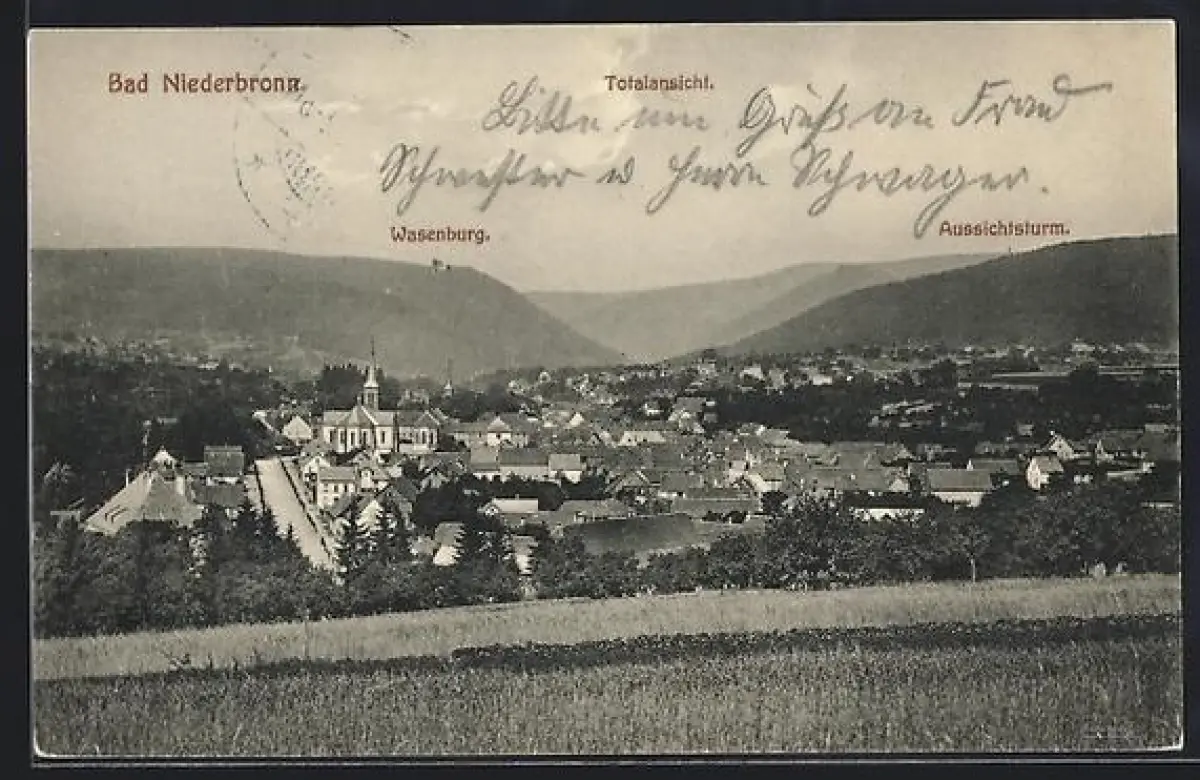AK Bad Niederbronn, Ortsansicht mit Wasenburg und Aussichtsturm