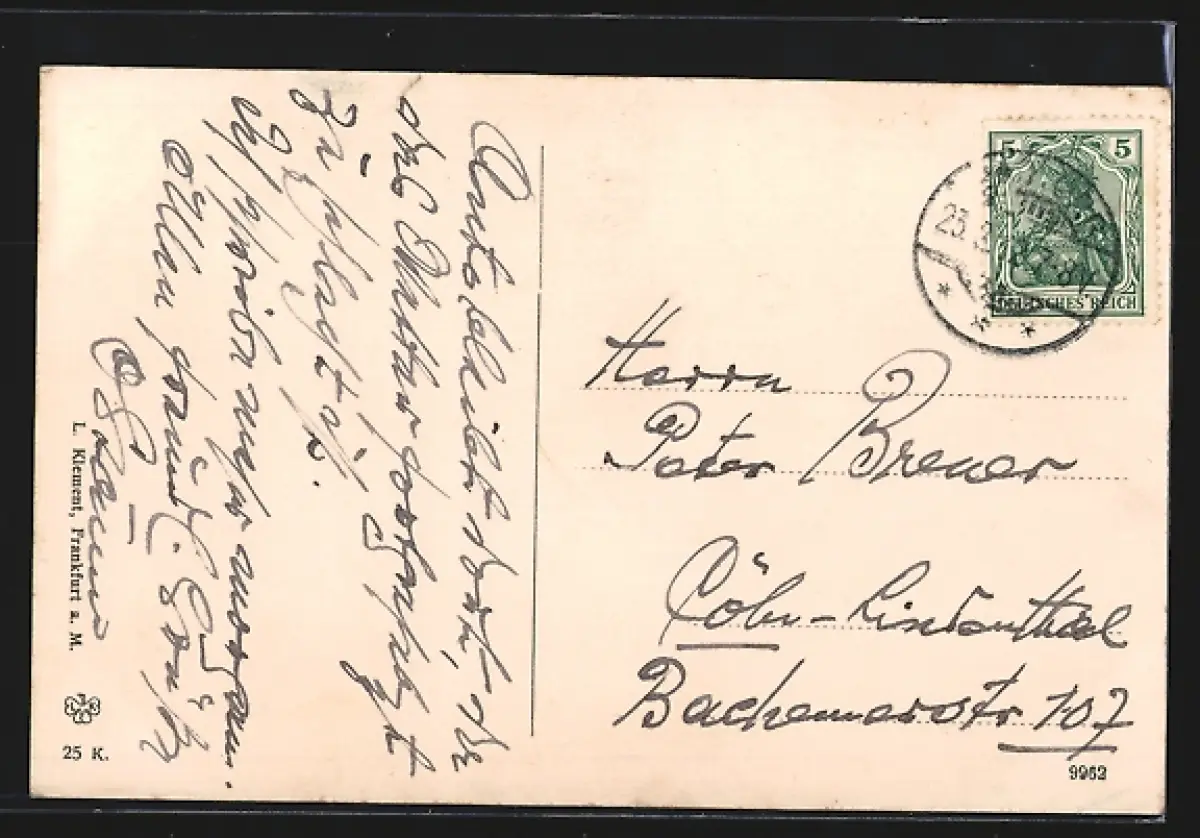 Personenbezogene Daten auf der Rückseite der Karte wurden durch blauen Textmarker unkenntlich gemacht. Die blauen Stellen sind auf die Vorderseite durchgeweicht und wirken sich negativ auf das Postkartenfoto aus