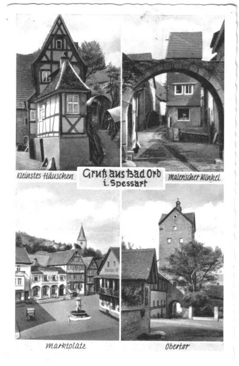 Ansichtskarte Bad Orb im Spessart vier Abb. - Kleinstes Häuschen, Malerischer Winkel, Marktplatz, Obertor Erhaltung I-II, Marke entfernt postalisch gelaufen, gestempelt: 24.7.[54] Verlag: Franz Fries, Bad Orb