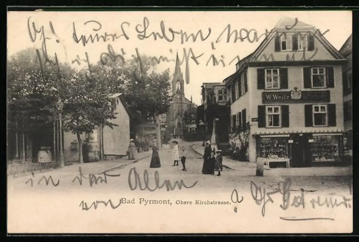 AK Bad Pyrmont, Obere Kirchstrasse mit Hoflieferant W. Weitz