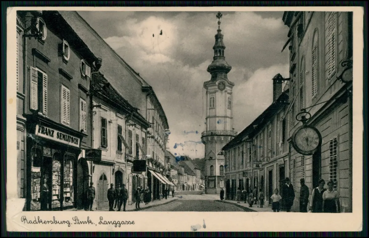 AK - Bad Radkersburg Langgasse Geschäft F. Semlitsch Kirche St Johannes 1942 gel